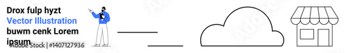 Person pointing at text, cloud, and shop icon illustrates cloud-based business systems. Ideal for business, technology, innovation, e-commerce, connectivity, cloud solutions and a simple landing