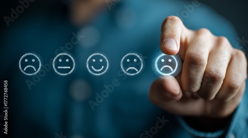 Person points at row of smiley faces individual gestures toward sequence of cheerful facial symbols