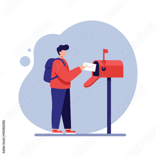 Person posting letter into red mailbox with backpack outdoors vector illustration