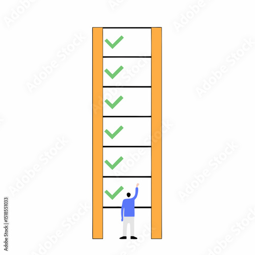 Person reaching for the last checkmark on a tall checklist ladder with completed tasks shown above it