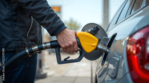 Person Refueling Car at Gas Station with Yellow Fuel Pump Nozzle in Close Up View During Daytime