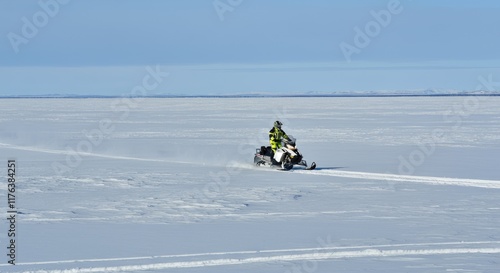 Person riding snowmobile across vast snowy landscape, surrounded by winter scenery