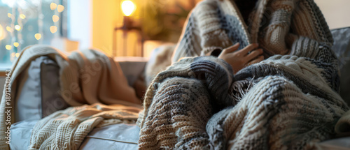 Person sitting on a sofa wrapped in layers of warm knitted clothes, feeling cold at home, winter discomfort, heating problems, energy saving and cozy indoor lifestyle concept.