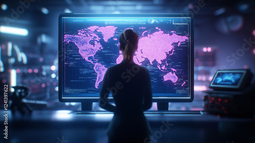 person stands in front of large screen displaying world map with digital data in vibrant pink hues, creating futuristic atmosphere