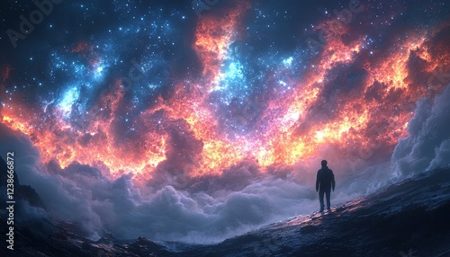 Person stands looking at cosmic clouds on rocky terrain. Ideal for fantasy background use