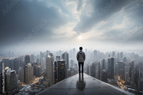 Person stands on rooftop overlooking vast urban landscape under cloudy sky