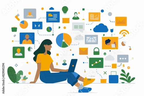 Person surrounded by colorful icons, representing digital communication and multimedia interaction