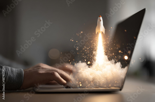 Person typing on a laptop with a realistic rocket launch illustration emerging from the screen, digital art with vibrant fiery and smoke effects