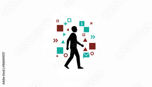 Person using AR technology in daily life. Flat design vector illustration of a silhouette walking with digital icons. Augmented reality and information interaction concept