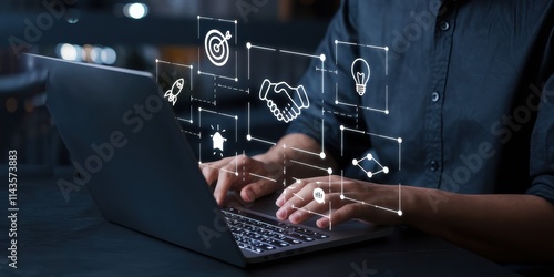 Person using laptop with digital business strategy icons