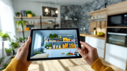 Person using tablet for virtual home interior design in modern kitchen