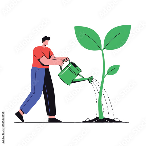 Person watering a small plant, symbolizing growth, new beginnings, and sustainable development in a simple flat illustration style.