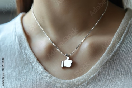 Person wearing a silver necklace featuring a thumbs up symbol on a casual day