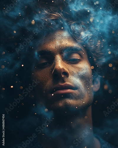 person with a galaxy within, celestial bodies replacing facial features, stardust skin texture
