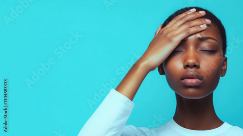 person with their hand on their forehead appears stressed against blue background
