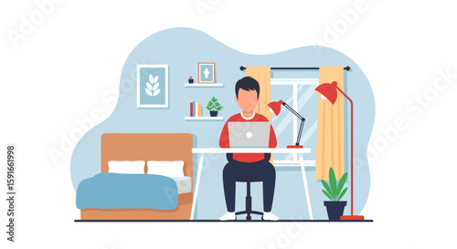 Person working from home on laptop, illustration for remote work, freelance, or work from home concept.