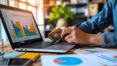 Person working on laptop with pen and papers on table