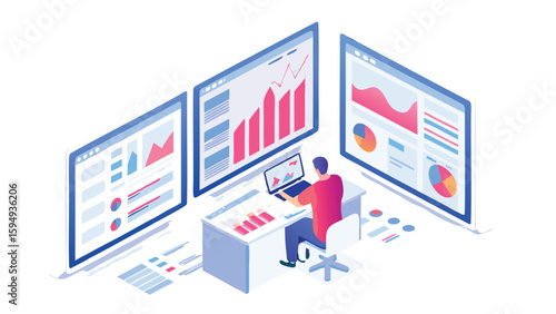 Person working with multiple screens displaying charts and graphs in an isometric view at a desk