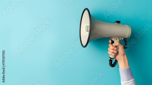 Person's hand gripping a megaphone against a blue background. Promotion ad concept.