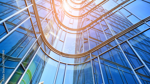 Perspective view to steel and blue glass. Commercial modern city of future. Business concept of successful industrial architecture. The sunlight falling on the building.
