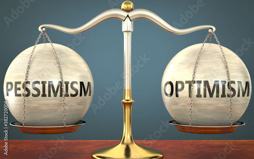 pessimism and optimism staying in balance - pictured as a metal scale with weights and labels pessimism and optimism to symbolize balance and symmetry of those concepts, 3d illustration