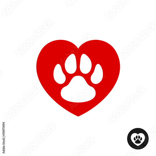 Pet paw love logo. Animal footprint with heart silhouette around.