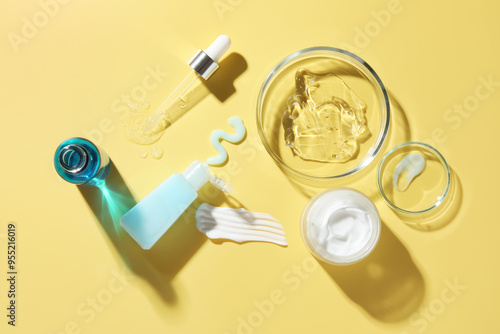 Petri dishes with cosmetic products and pipette on yellow background, flat lay