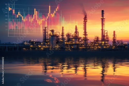 Petrochemical refinery at sunset with vibrant skies and silhouetted structures reflecting industrial beauty.