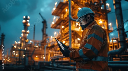 Petroleum refinery engineer in oil and gas industry with PPE personal safety equipment to inspect using tablet.