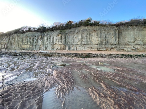 Pett Level Beach at Sunset. pool of sea ocean water rocks in foreground. Winchelsea Beach meets the cliffs on the South coast of England East Sussex UK