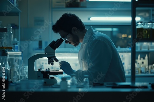 Pharmaceutical lab with scientist using microscope, with copy space
