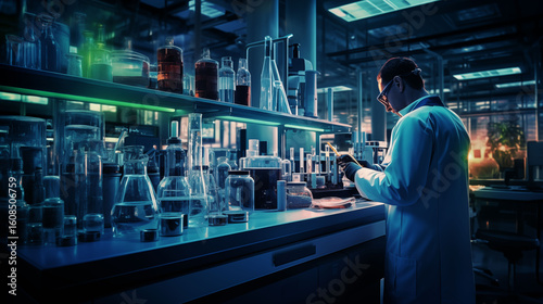 Pharmacist preparing medication in a modern lab, laboratory glassware, clean medical setting, safety gloves