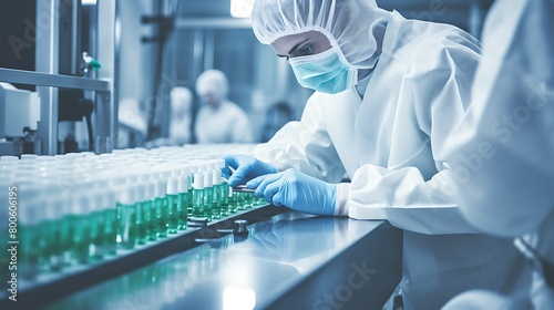 Pharmacist scientist with sanitary gloves examining medical vials on a production line conveyor belt in a pharmaceutical factory