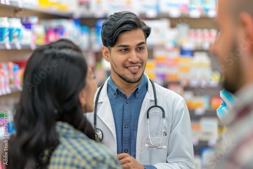 pharmacist speaking to clients in a pharmacy