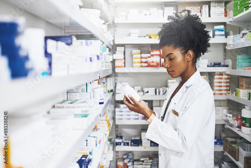 Pharmacy, healthcare and woman with product to check medical info, shelf inventory or price. Prescription medicine, stock and pharmacist reading box label for health benefits of pharmaceutical drugs