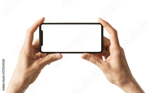 Phone mockup in hand - clipping path, Studio shot of smartphone with blank white screen for web site design, app for mobile phone and advertisement, Isolated design element transparent background