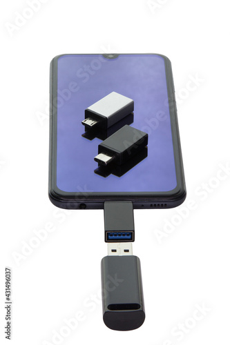 Phone on a white background data transfer via a universal USB flash drive adapter