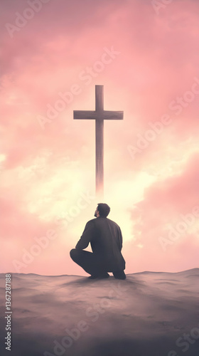 Photo A Man Kneeling Facing Wooden Cross In Evening Light and Pink Sky