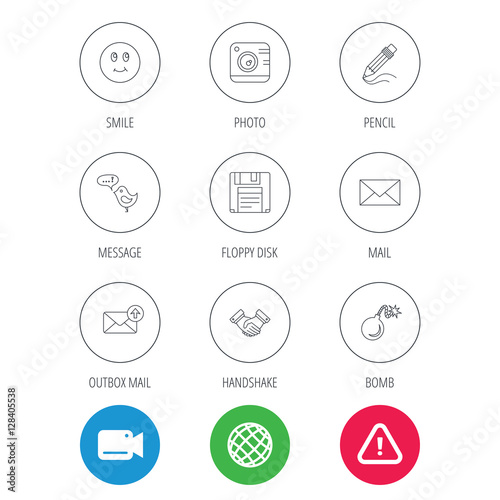 Photo camera, pencil and handshake icons. Inbox e-mail, message speech bubble and smile linear signs. Video cam, hazard attention and internet globe icons. Vector