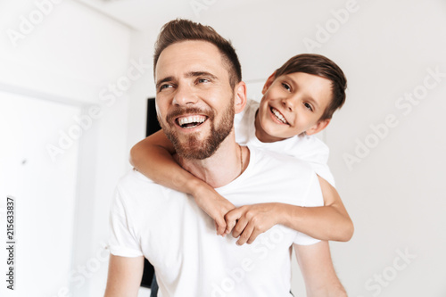Photo closeup of happy father piggybacking his son 8-10, while resting in white bright apartment