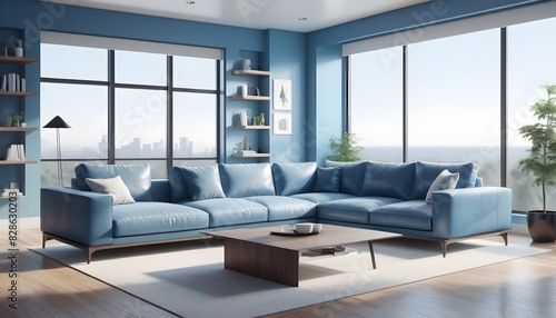 apartment, comfortable, decor, furniture, hall, home, interior, modern, pillow, render, room, sofa, wall, living, living room, three-dimensional, blue, beige, rug, pattern, pouf, bookcase, telescope, poster, vintage, rattan, indoor