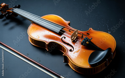 Photo of a beautiful brown violin with water droplets is lying on a dark surface with