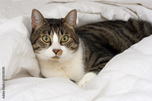 Photo of a cute cat hiding under a blanket, looking at camera. The photo is against a background showing a comfortable home. Space for copy.