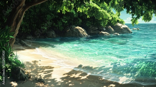 Photo of a serene tropical beach with clear turquoise water and lush green foliage