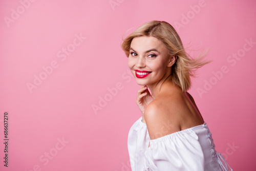 Photo of adorable cute graceful girl dressed white clothes posing empty space isolated on pink color background