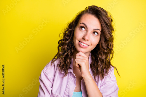 Photo of adorable young lady hand on chin look interested empty space imagination isolated on yellow color background