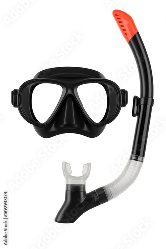 Photo of black scuba diving mask and snorkel set isolated on transparent background