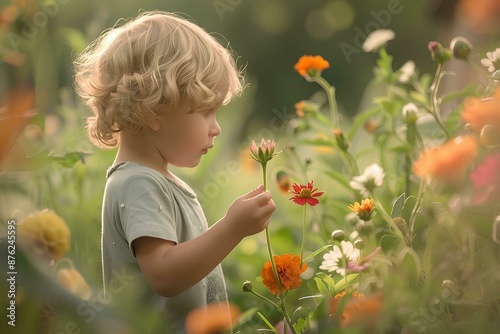 Photo of blonde boy in a blue shirt picking flowers in the garden, from the side view, with a blurry background, on a sunny day, with natural light