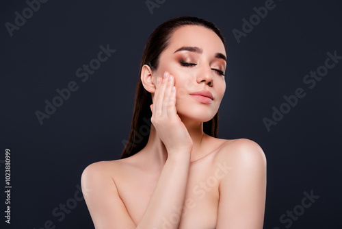 Photo of charming dreamy woman enjoy smooth skin isolated on dark grey color background