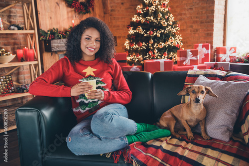 Photo of charming pretty dark skin woman dressed red sweater drinking coffee puppy smiling indoors house home room